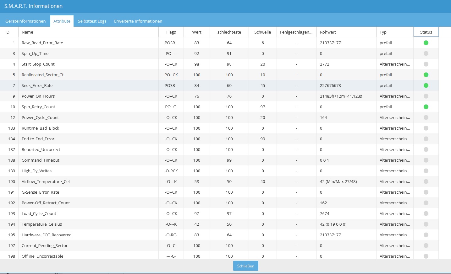 Ich habe mir die SMART Werte meiner NAS Platten angeschaut, die als "OK" markiert sind. Allerdings kommen mir die Werte etwas seltsam vor, exemplarisch habe ich mal eine Tabelle beigefügt. Alle Platten haben solche Werte. Verbaut sind HDDs vom Typ Seagate BarraCuda 3.5, 6.0TB in einem RAID5 Verbund, das ganze mit OMV. System ist 5.6.24