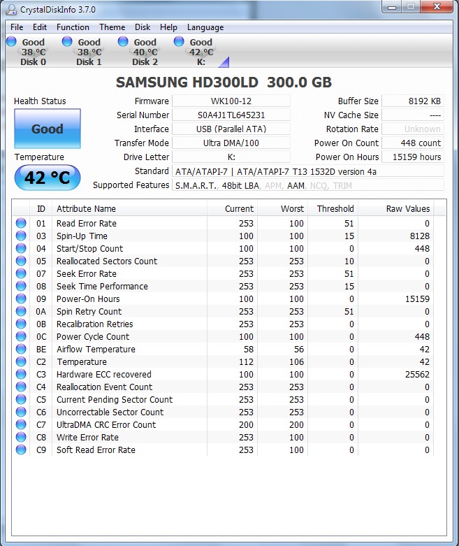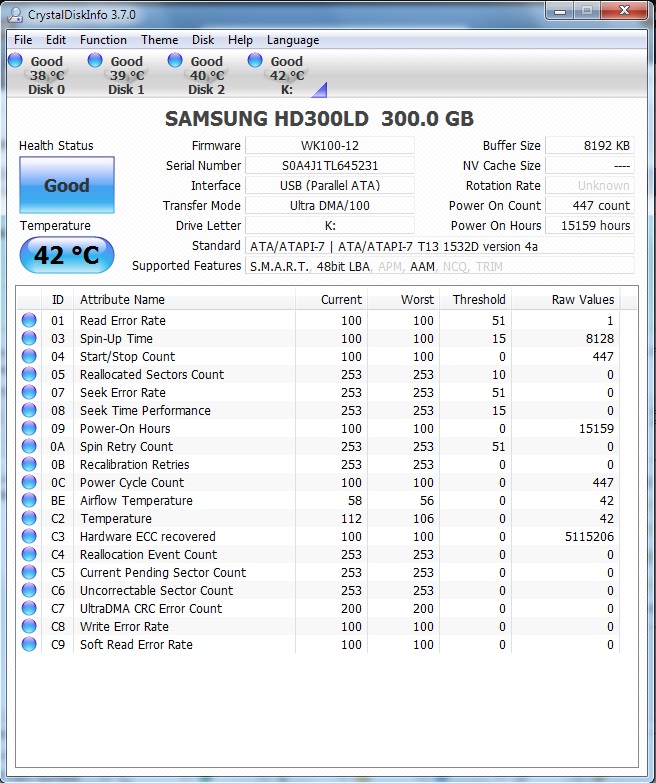 ich habe eine externe Festplatte (Samsung HD300LD in bluemedia-Gehäuse über USB2 angeschlossen). Nun ist es so, dass ich meine Platten seit kurzem Dauerhaft mit CrystalDiskInfo überwache. Was mir dabei aufgefallen ist: