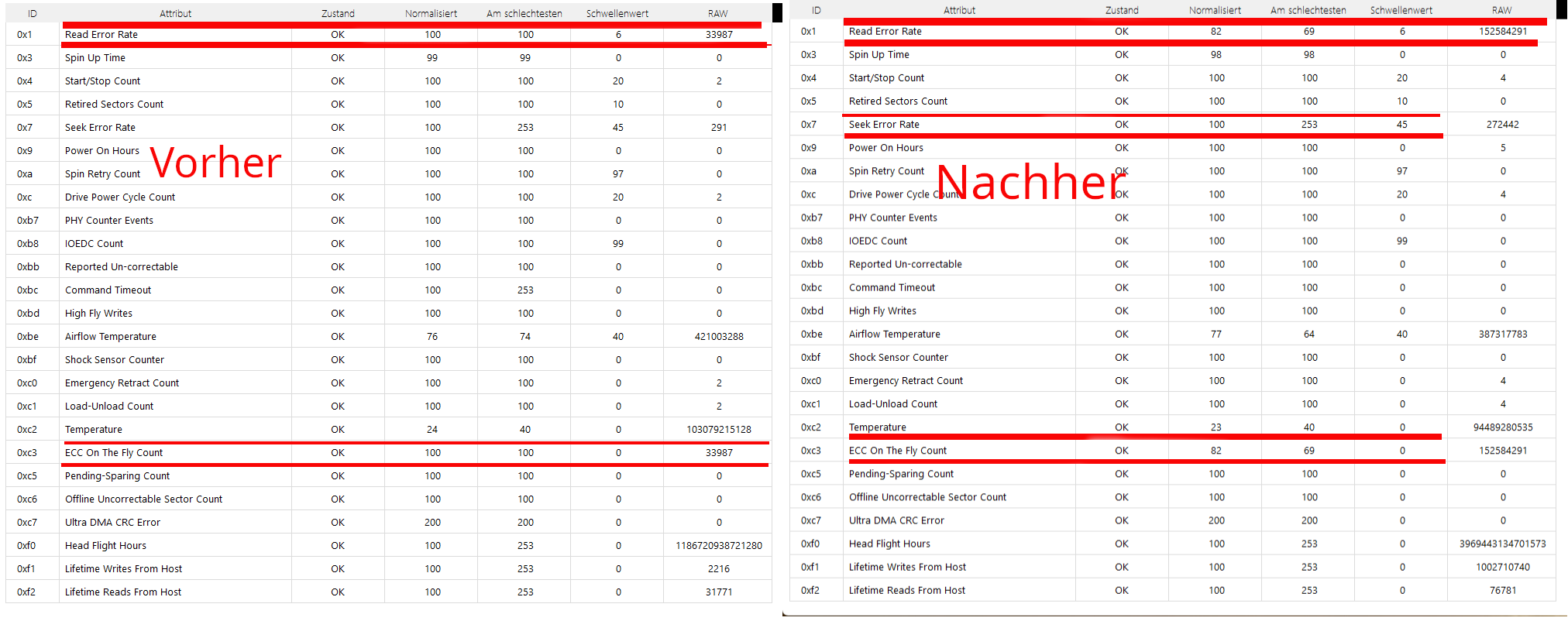 Gestern habe ich Daten von einer Backup Festplatte auf die neue Festplatte kopiert, daraufhin haben sich Read Error Rate und ECC on the fly count verändert.