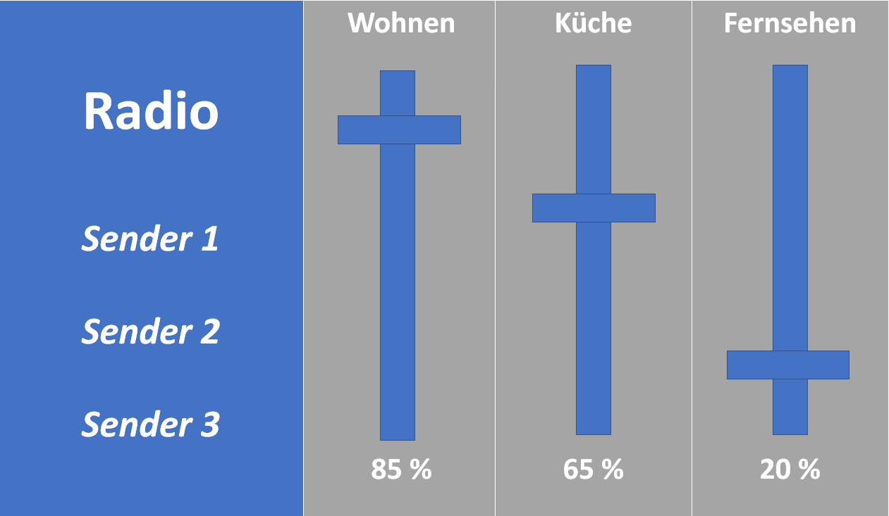 Ich hätte dort bspw. sehr gerne eine Steuerung für das Radio (bspw. Liste der letzten x genutzten Sender) und drei einzelne Regler für drei Zimmerbeleuchtungen (Küche/Wohnbereich/Heimkino-Ecke).