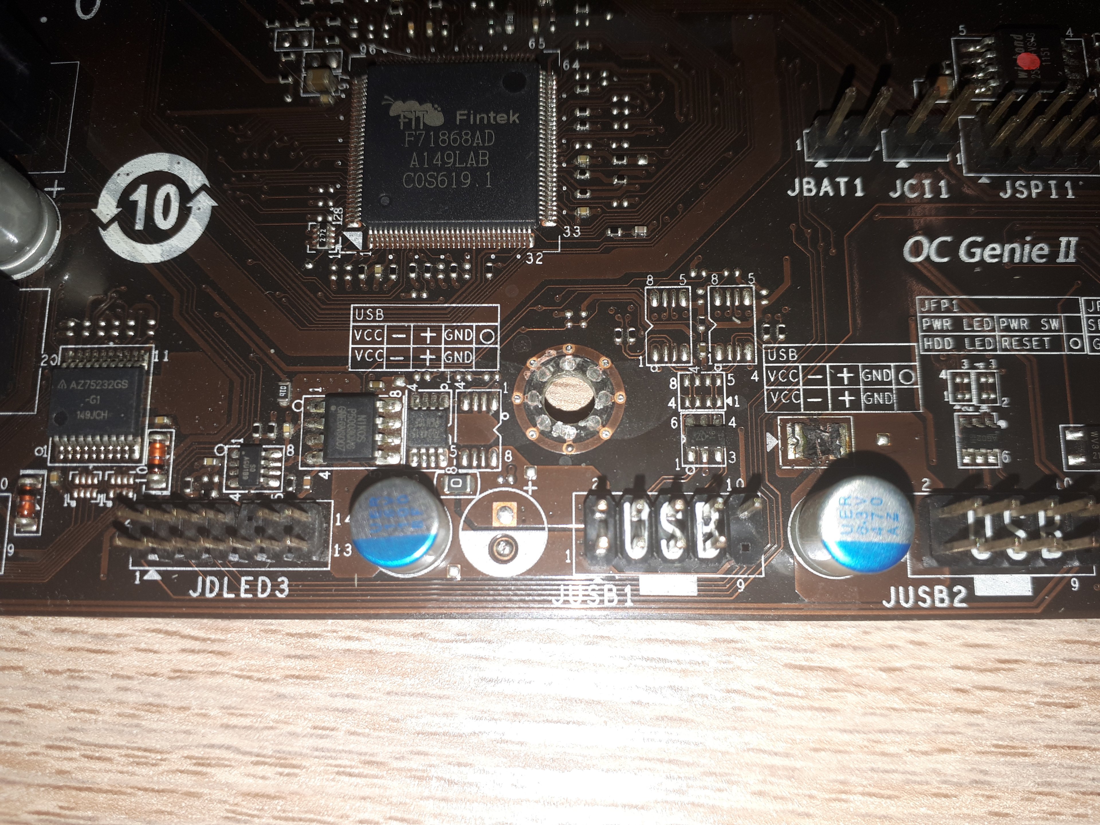 Um es trotzdem abzukürzen: Wenn der Sicherungstausch darauf abzielt, dass Board zu reparieren, wird das nichts bringen. Die durchgebrannte Sicherung liegt in der 5V Leitung für den JUSB2-Pfostenstecker und hat somit 0 Einfluss auf die eigentliche Funktion des Mainboards. Dir fehlen lediglich die 5V an den zugehörigen USB-Ports. Sieht man sehr schön am Layout.