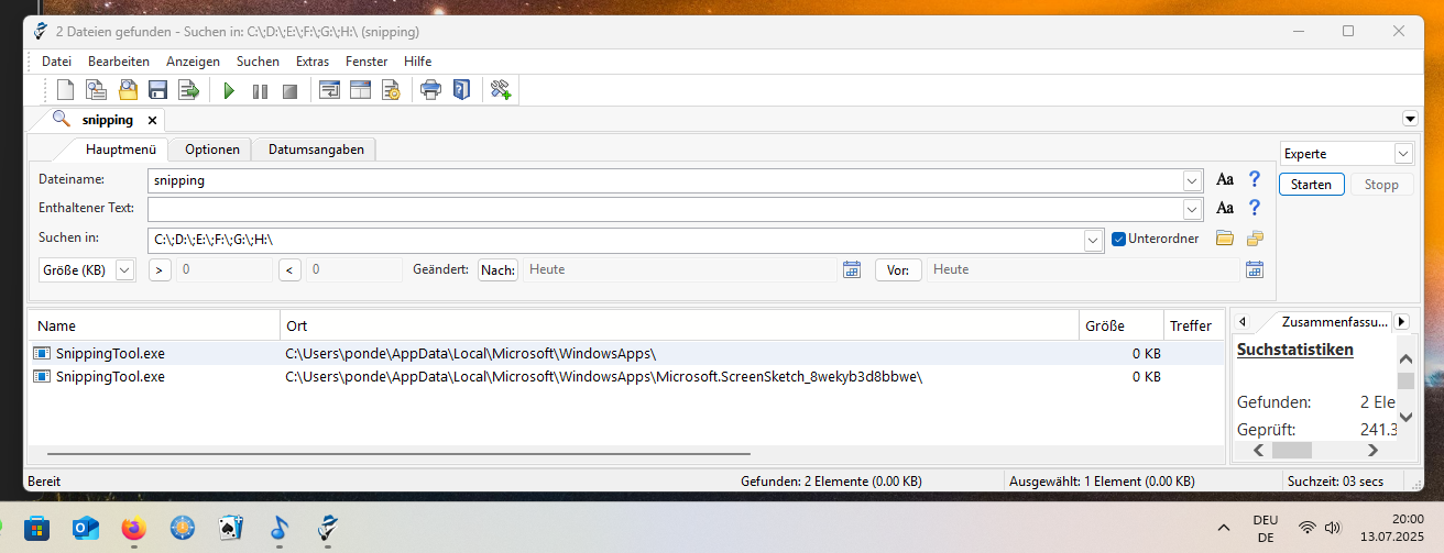 Vielleicht macht das suchen nach Snipping Tool, oder nach SnippingTool, den Unterschied?