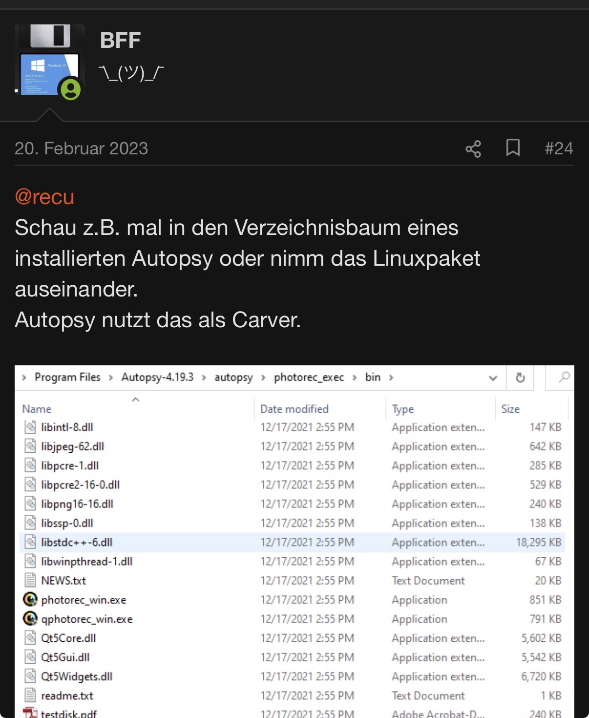 Die Binaries von PhotoRec sind da drin. Und wenn Du endlich mal Autopsy benutzen würdest könntest Du die Meldungen von/mit PhotoRec sehen.