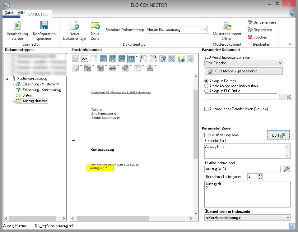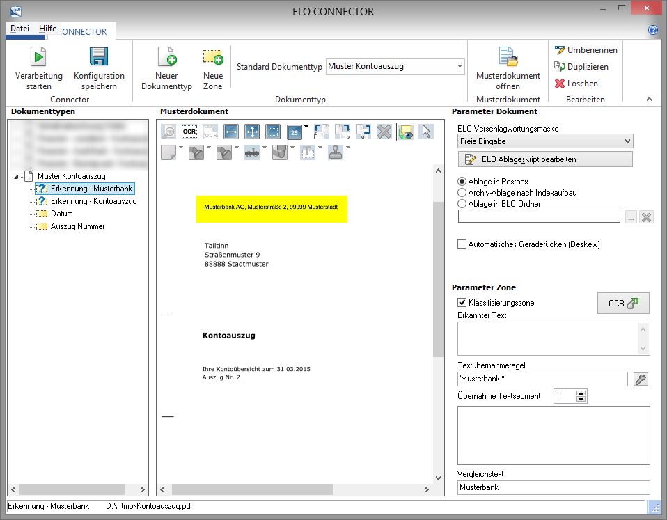 In ELOoffice kann ich Dokumententypen definieren. Für die werden OCR-Bereiche festgelegt die anhand von Stichwörtern das Dokument erkennen. Zusätzlich lassen sich per OCR gezielt Schlagwörter extrahieren, die ich dann für die Dateibenennung verwenden kann.
