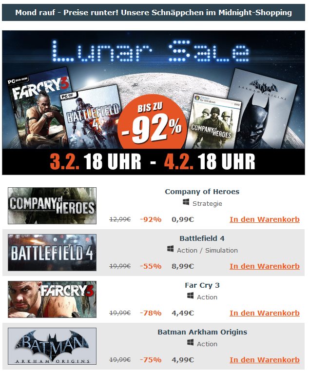 Gamesplanet.de macht heute abend von 18 Uhr für 24 Stunden ein paar nette Angebote, zumindest wäre Company of Heroes ein Kracher: