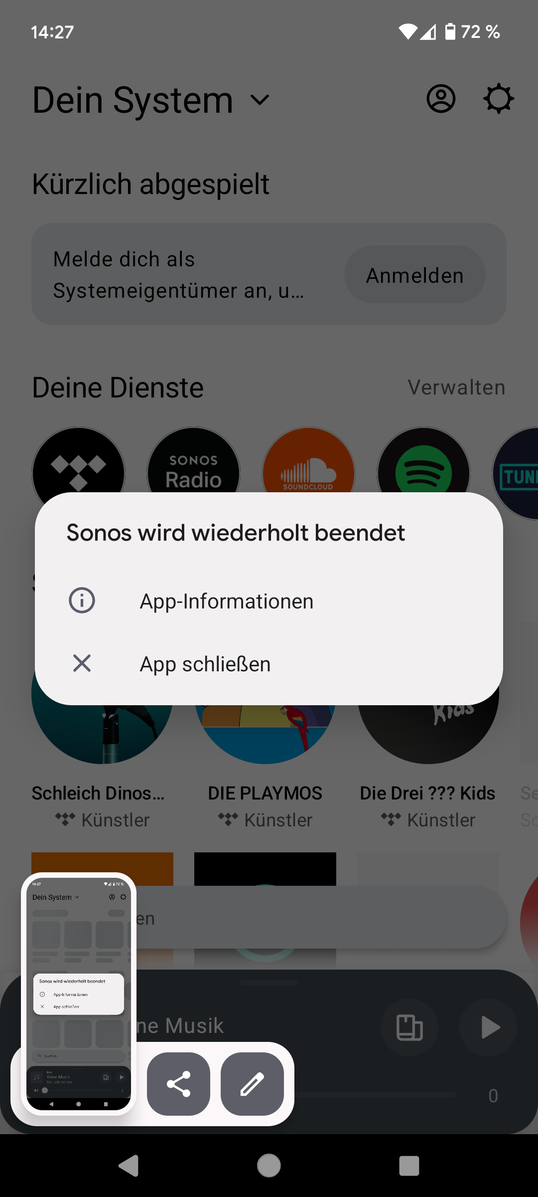 Es gibt die neue Sonos App ja bereits seit einigen Wochen und mal abgesehen davon, dass vieles massiv (!) schlechter geworden und nichts besser geworden ist habe ich jetzt seit drei Tagen das Problem, dass alle Android Telefone (Pixel 6, Pixel 7a) und Tablets die App nicht mehr starten. Das Problem ist tatsächlich über Nacht (Update?) auftreten. Die App hängt entweder auf dem Sonos Logo fest oder stürzt einfach auf den Desktop zurück. Ab und zu mal sehe ich ich mal Hintergrund, dass die App gestartet wurde, allerdings ist Vordergrund eine Warnmeldung zu sehen. App stürzt dann auch wieder ab. Neuinstallation, Cache leeren etc hat alles nichts gebracht.