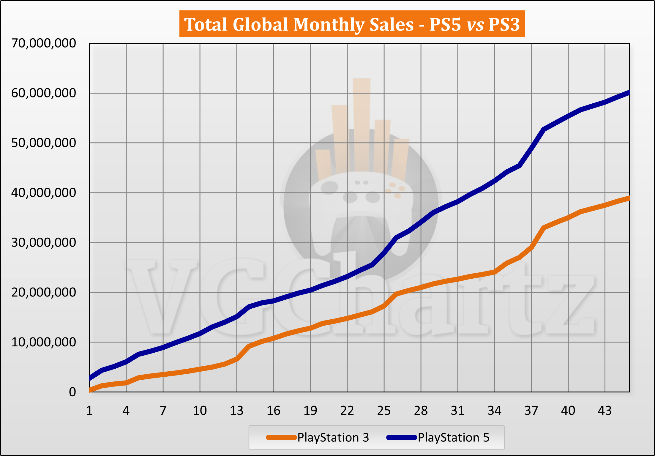 PS4 + PS5 haben gleich lange gebraucht, um 60 Mio. verkaufte Einheiten zu erreichen... und die PS3 lag nach einem vergleichbaren Zeitraum noch knapp unter 40 Mio. verkauften Einheiten.