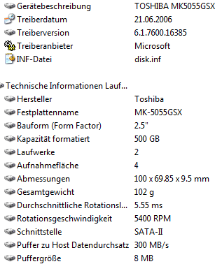 Bei der Festplatte habe ich allerdings nicht, wie eigentlich alle anderen Forum-User auf Notebookjournal.de zur 500GB Variante, sondern zur 320GB Variante gegriffen (Toshiba MK3265GSX). Von ihr hört man keinerlei Zugriffsgeräusche sie gibt sich durchgehend sehr leise.