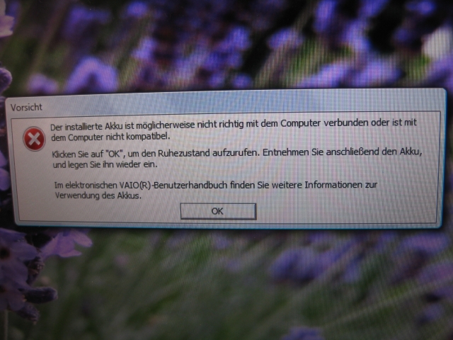 1. Folgende Fehlermeldung mit eingelegtem Akku (siehe erstes Bild). Vermutlich ist der Akku jetzt einfach ganz kaputt? Ist nicht weiter schlimm, der hat zuletzt eh nur noch eine Viertelstunde gehalten...