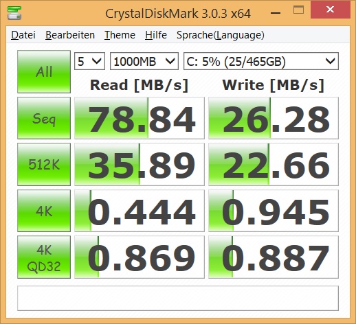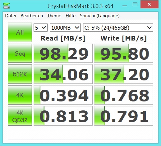 In Windows scheint die Geschwindigkeit recht normal zu sein. Habe nun mal CrystalDiskMark ausgeführt.