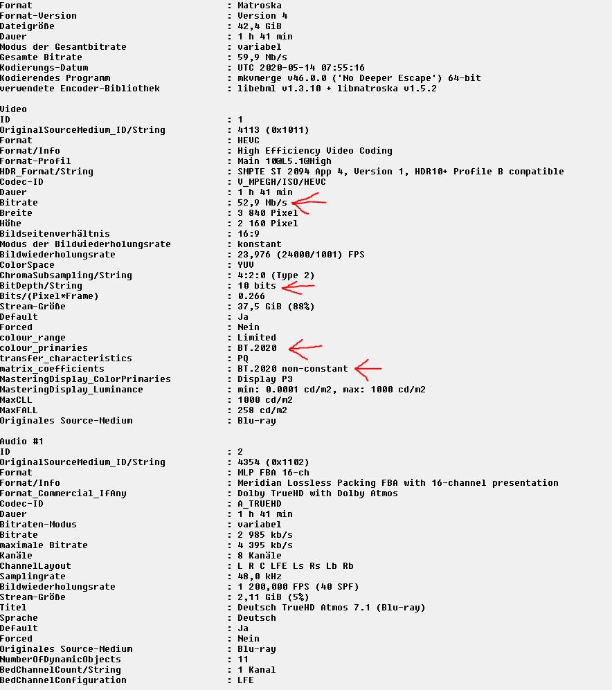 Hmm, die Bitraten sind nicht allzu hoch. Einmal 34 MBit/s als Maximum, der Rest ist nicht der Rede wert. Aber selbst die 34 sind nicht wirklich viel. Außerdem verschiedene Codecs (3x AVC 1x HEVC) alles nur 8 Bit und BT709 also auch kein HDR.