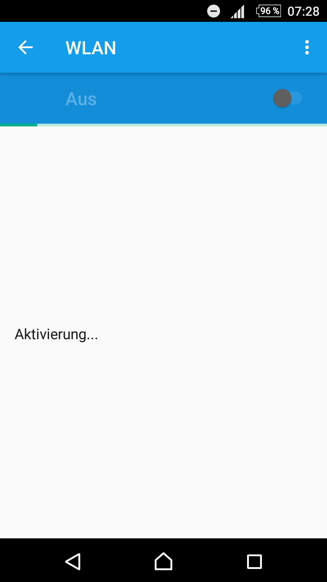 Als erstes ist die WLan Verbindung ausgefallen. Daraufhin bin ich in den Einstellungen auf "WLan" gegangen und habe es ausgeschalten und wieder eingeschalten.Das Handy hat dann ungefähr 10 Minuten nach Netzwerken gesucht, jedoch ohne Ergebnis. Danach habe ich es mehrmals neu gestartet.Seitdem sehe ich jedes mal (auch nach wiederholtem Neustart) wenn ich in die WLan Einstellung gehe das angehängte Bild. Das Handy versucht das WLan zu aktivieren obwohl es eigentlich ausgeschalten ist. Ein anderes Problem ist, falls der angehängte Bildschirm nicht zu sehen ist, dass das WLan ordnungsgemäß ausgeschalten ist (also steht da der normale Text ( Wlan aktivieren um verfügbare WLan Netzwerke anzuzeigen oder so ähnlich)). Jedoch bleibt dieser Text stehen auch wenn ich den Schalter auf "An" stelle und es verändert sich nichts.
