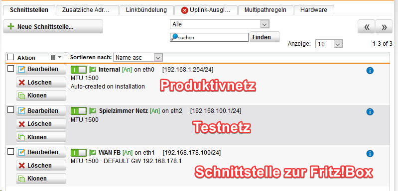 Ein Netz wird das Produktivnetz und das andere ein Test-Netz. Beide Netze sollen ins Internet kommen und auch untereinander Geroutet werden. Heißt aus dem Produktivnetz darf auf das Testnetz zugegriffen werden und umgekehrt.