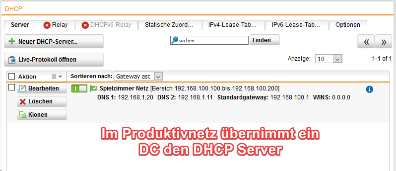 Die Sophos spielt im "Spiele-Netz" DHCP Server trägt aber als DNS Server die 2 DCs aus dem Hauptnetz ein, damit die dortigen Rechner eine ordentliche Namensauflösung bekommen.