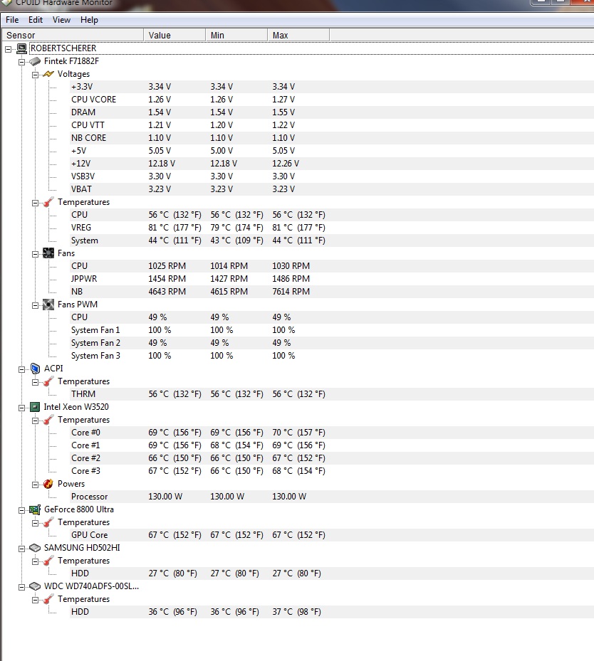 Erst hatte ich mir logischerweise ueber die CPU-Temps(idle 24° Last 55°, Corsair H50 Extern mit 2 Lüftern)gefreut. Doch dann ein Blick in Speedfan mit alle Temps hat mich getroffen.
