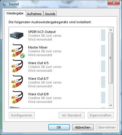 Schließlich fand ich einen funktionierenden Treiber. Die Seite weiß ich leider nicht mehr. Nun ja - alles gut und schön - jetzt läuft die Karte unter XP. Da ich sie aber vorrangig unter Vista nutzen will (da sind DD-Spiele wie GTA IV installiert), wollte ich den Treiber auch unter Vista installieren. Es hat auch anstandslos geklappt. - Bis ich die dazugehörige Software öffnen wollte. Es kam eine Fehlermeldung (habe die Software gerade nicht installiert - Meldung wird nachgereicht). Also rief ich die Soundeinstellungen in der Systemsteuerung auf. Auf den ersten Blick war alles in Ordnung, doch dann sah ich, dass die Karte nur als Stereokarte erkannt wird...
