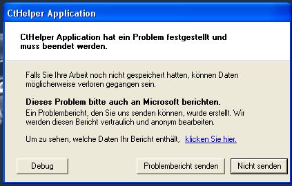 Ich benutzte Windows XP Home, und wenn ich mich da anmelde, bekomme ich eine Meldung, dass "CT Helper Application hat ein Problem festgestellt und muss beendet werden". Kurz danach kommt noch eine Fehlermeldung: "Die Anweisung in "0x00bcc42f" verweist auf Speicher in "0x00000008". Der Vorgang "read" konnte nicht auf dem Speicher durchgeführt werden."