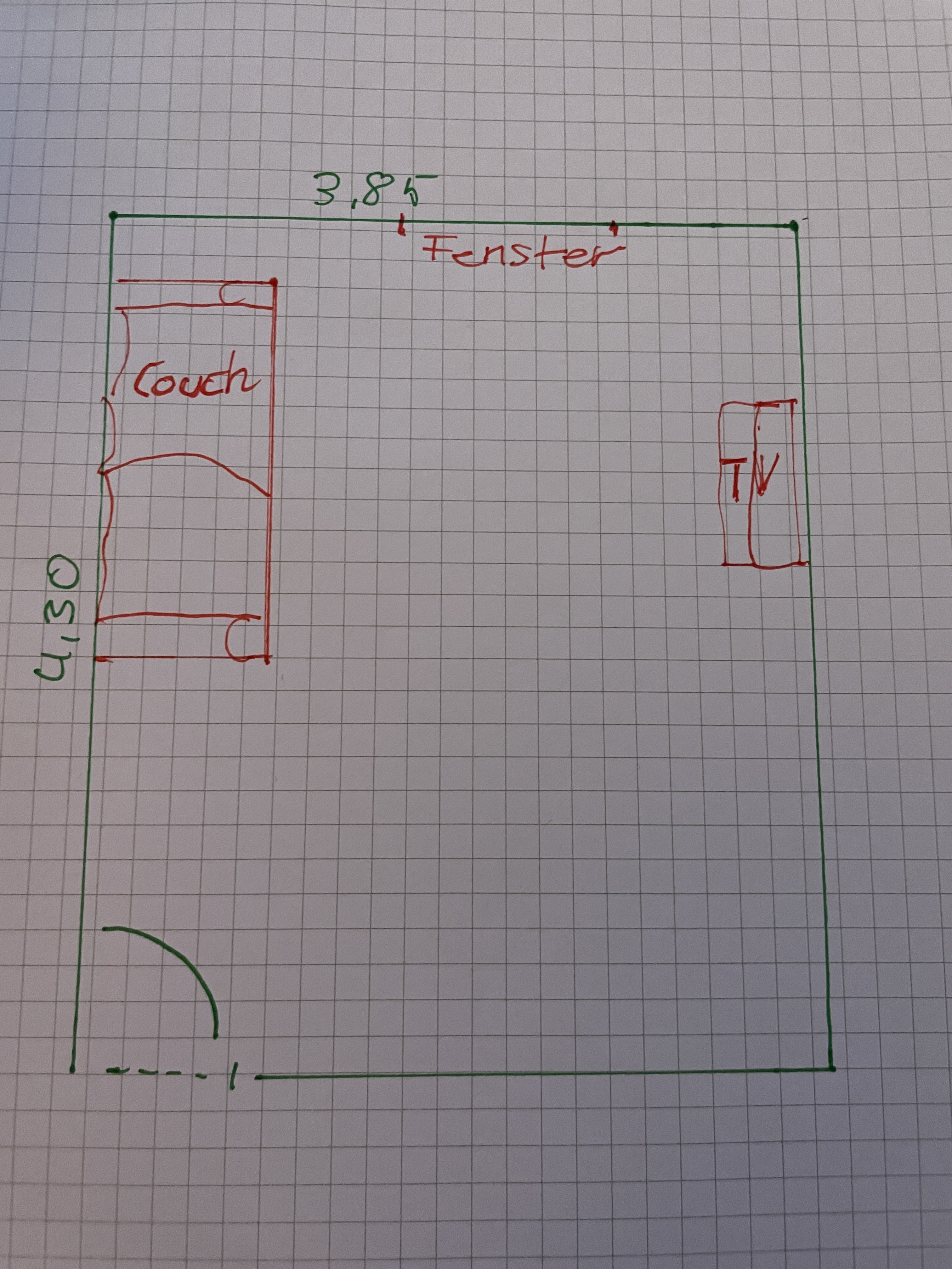 - Raumfläche / Größe: Siehe Anhang, in etwa 16 QM, wobei die Couch nicht weiter nach unten verrückt werden sollte.