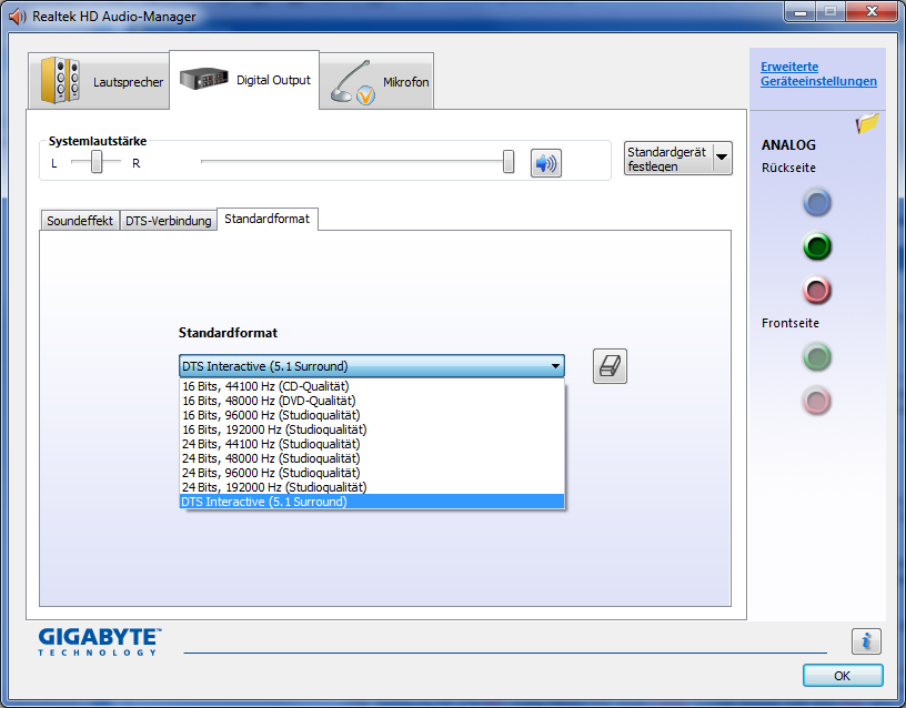 Normalerweise kann man die Soundausgabe bei Windows konfigurieren (Stereo, 5.1 etc) das kann ich bei dem Realtek Digital Output nicht...