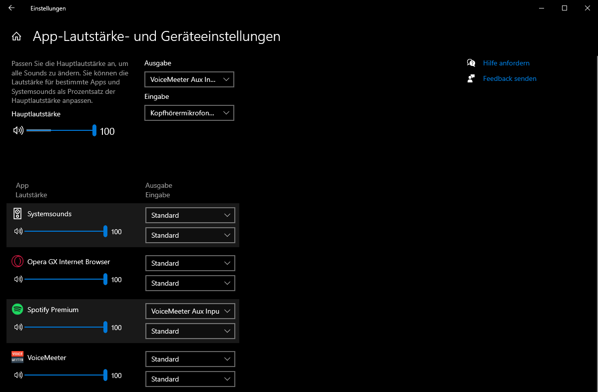 Mittlerweile habe ich rausgefunden, dass es in den Windows Einstellungen den Reiter "App-Lautstärke- und Geräteeinstellung" (s. Bild) gibt welcher meine Anforderung erfüllt, jedoch stört es mich, diesen jedes Mal über die Windows Suche zu öffnen.
