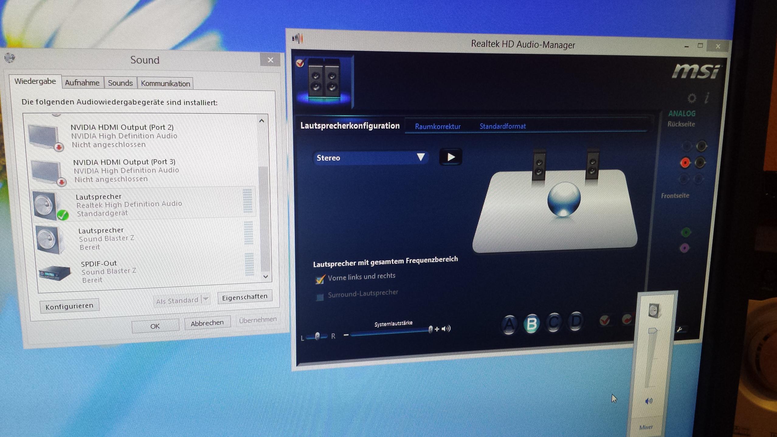 Onboard ist es der Realtek ALC1150 was ja nicht schlecht sein soll und KArte habe ich die Sound Blaster Z.