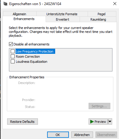 Mein OS ist Windwos 10 Pro und die Boxen sind über den Monitor angeschlossen, welcher über DisplayPort mit dem PC verbunden ist.