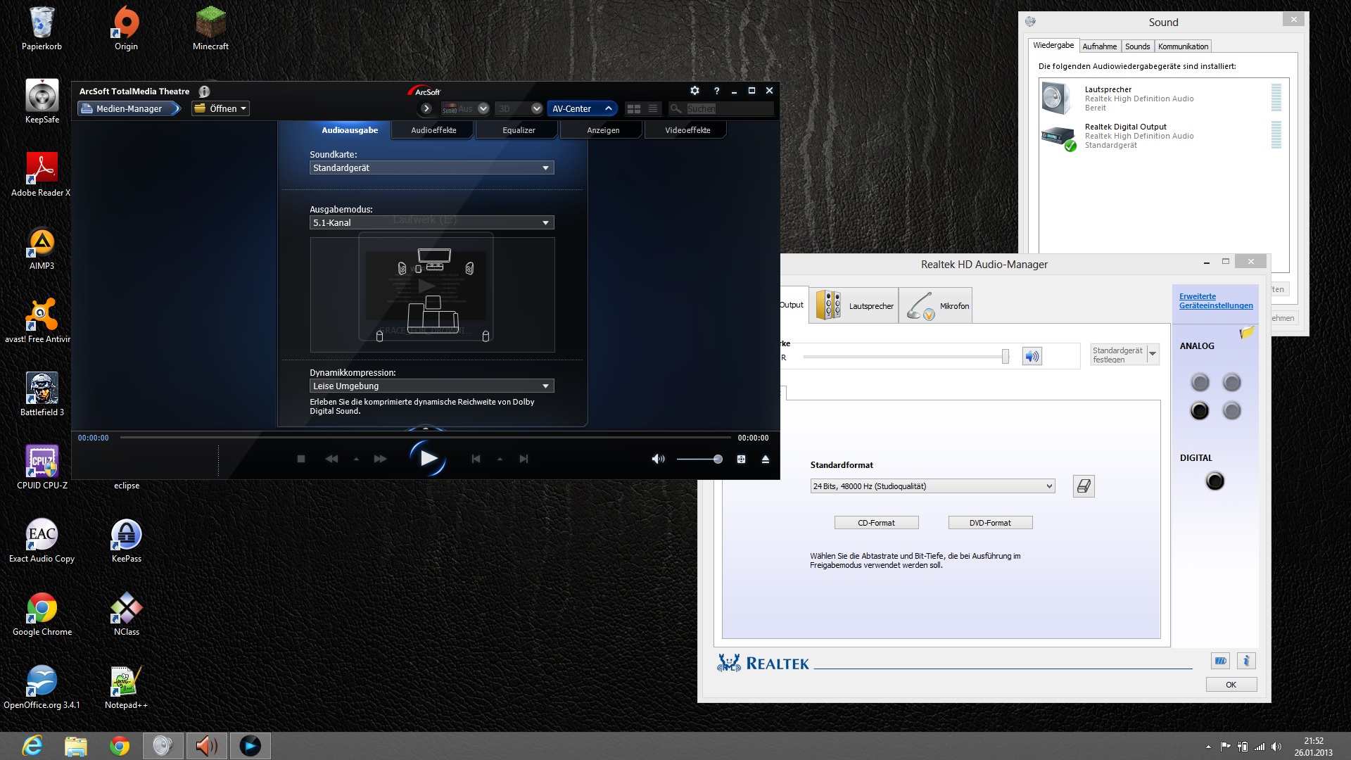 Ich würde gerne über meinen Laptop eine Blu-ray mit 5.1 Sound gucken. Der Laptop ist über einen optischen Ausgang mit meinem Soundsystem verbunden, selbiger ist auch als Standardgerät eingestellt. Allerdings die Playersoftware (ArcSoft Total Media Theatre 5) partout die integrierten Lautsprecher des Laptops benutzen.