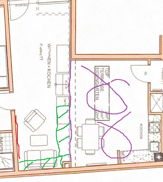 Die lila Linie zeigt hierbei, wo die Küche erhöht ist, diese ist quasi auf einem "Podest". Sprich das Wohnzimmer ist um 40cm nach unten versetzt.