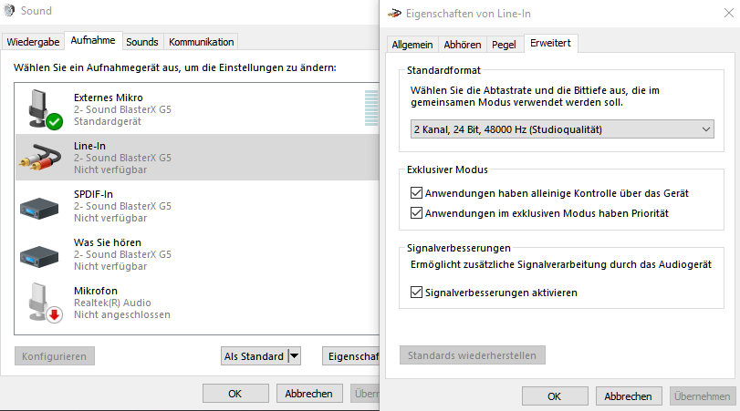Mich würde mal interessieren, was im (nicht aktiven) Line-In Gerät des G5 für eine Samplerate voreingestellt ist. Mein Verdacht ist, dass dort die 16000Hz gewählt sind und sich irgendwie auf die Aufnahme des Mic auswirken und die Auswahl der Samplerate des Mics gar nichts bewirkt.