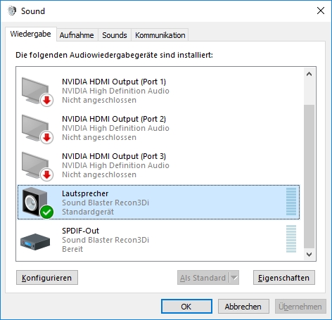 Das Wiedergabegerät ist in der SoundEinstellung: "Lautsprecher / Sound Blaster Recon 3Di / Standardgerät"