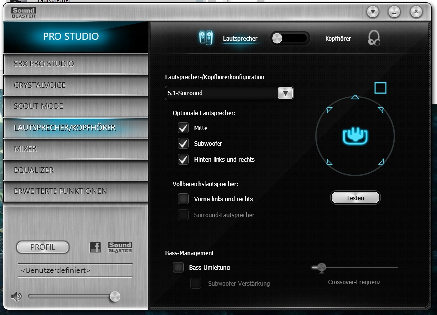 Für Rear Lautsprecher habe ich Lautstärke auf 100% (Regelung mache ich dann direkt am 5.1 System)