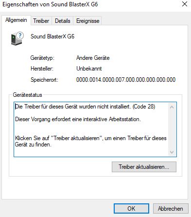 Jetzt dachte ich, dass ggf die G6 das Problem nicht hat, aber auch hier ist wieder das selbe Problem aufgetreten: Karte wird im Gerätemanager erkannt, aber der Treiber kann nicht installiert werden.