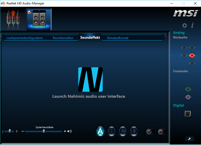 gestern habe ich meine neuen Kopfhörer Teufel Aureol Real bekommen und bin bisher recht zufrieden, nur ist mir zu wenig Bass vorhanden. Bei meinem PC mit MSI z170a Gaming M5 Motherboard habe ich jedoch bei dem Realtek HD-Audio Manager keine Equalizer-Funktionen, ich werde immer auf Nahimic verwiesen, auch wenn ich einen "freien" treiber von Chip installiert und Nahimic deinstalliert habe. Mit Nahimic kann ich aber keine einzelnen Frequenzbereiche anpassen, sondern habe nur die möglichkeit, Bass und Höhen hochzuregeln, klingt dann aber nicht gut.