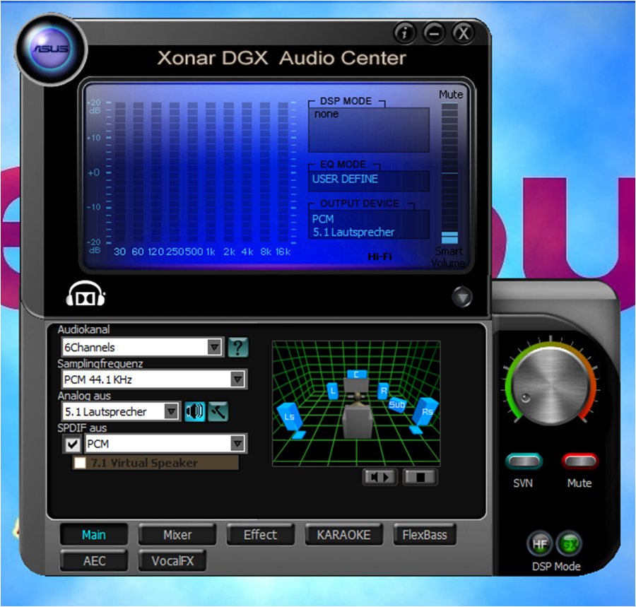 Wenn ich meine Anlage mit meiner Soundkarte (Asus Xonar DGX 5.1 PCI-Express Sound Karte) verbinde bekomme ich zwar aus allen Boxen Sound aber nur Stereo und keinen echten 5.1 Surroundsound. Anbei habe ich einen Screenshot wie ich des Programm von dem Xonar Treiber eingestellt habe. Zwischen meinen Kopfhörern und der Soundanlage kann ich mit dem Haken bei SPDIF (PCM) wechseln. Des weiteren sollte ich erwähnen dass ich mich beim Thema Audio schlecht auskenne