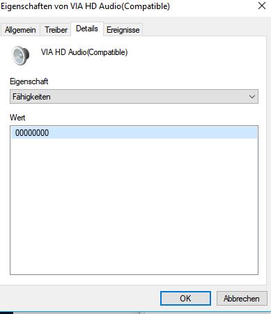 Vielleicht muss ich hir in der regedit den wert Korigieren ? (-> siehe Anhang) Eigenschaften von VIA HD Audio Fähigkeiten Wert 00000000