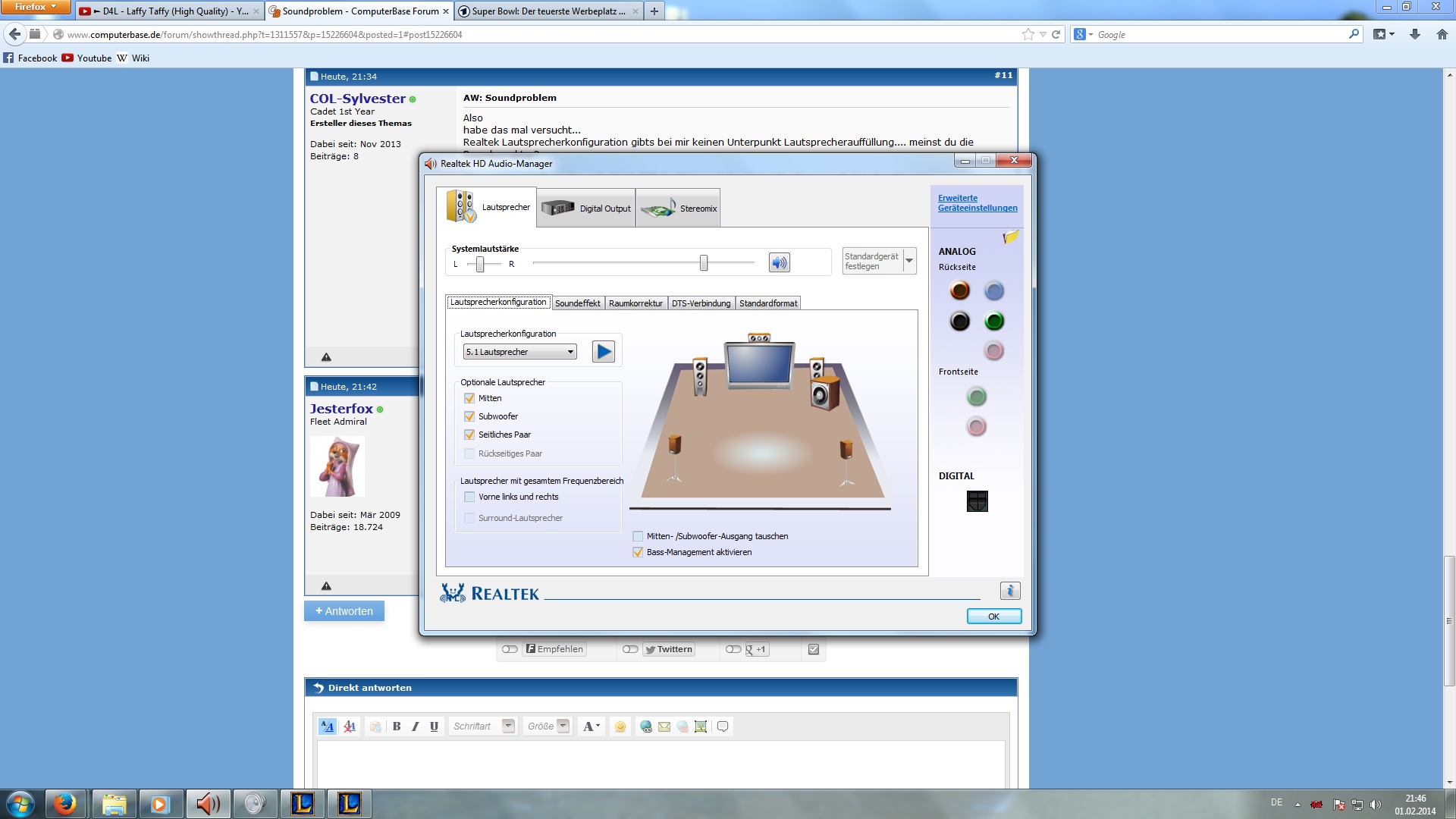 habe eine 5.1 Soundanlage (Teufel Concept E) und eine Realtek Onboard Soundkarte (bis zu 7.1 fähig), Treiber schon mehrfach aktualisiert/neuinstalliert.