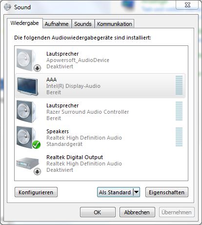 Der Fernseher wird als Wiedergabegerät erkannt (auch wenn er da seltsamerweise "AAA" heißt) und als bereit angezeigt. Aus irgend einem Grund kann ich ihn jedoch nicht als Standardwiedergabegerät auswählen. Der Button ist klickbar, aber es passiert einfach nichts.