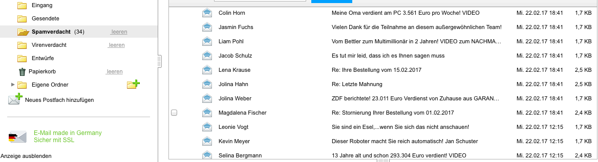 Ich habe seit ein paar Jahren zwei Freenet E-Mail Konten und momentan gibt es wiedermal eine heftige Spamwelle auf beiden Konten.