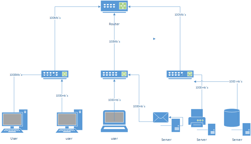 -Alle Switche am Router Angeschlossen via 100Mb´s (Der Router hat keine Gigabit Ports)