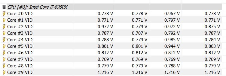 durch einen Zufall habe ich festgestellt, dass Programme wie Aida64 oder HWInfo bei einem Kern immer dieselbe statische Spannung anzeigen von 1,216 Volt. Während die Spannungswerte der anderen Kerne sich konstant ändern.