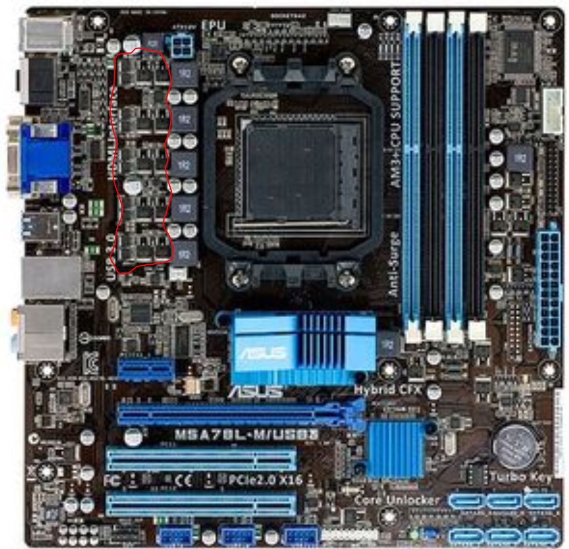 Ja, das schaut charakteristisch nach heißen Spannungswandlern aus. Also Kühlkörper, Top-Blower... wie oben schon empfohlen ausprobieren.