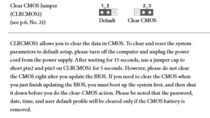 2. Den Jumper, der im Moment auf Pin 1 und 2 steckt abziehen und auf Pin 2 und 3 stecken, nach 5 Sekunden wieder zurueck auf Pin 1 und 2 stecken. Danach Computer neu starten.