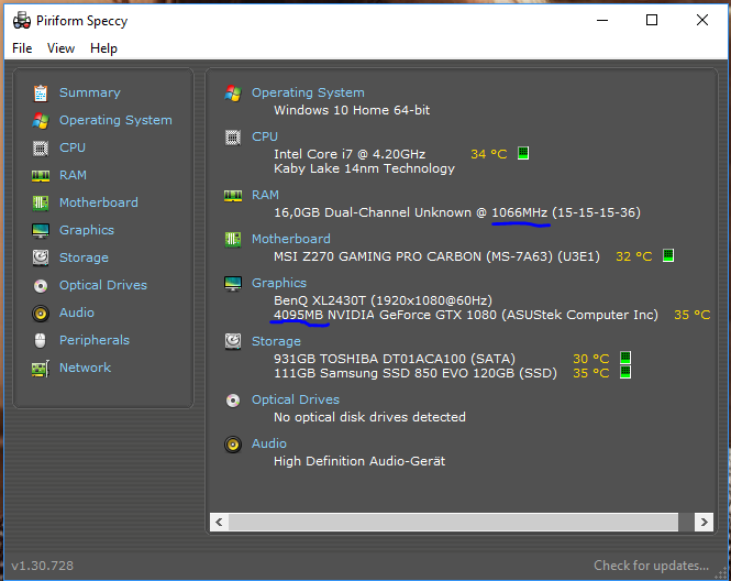 ich habe mir heute meinen Rechner zusammengebaut, alles läuft tip top. Dann habe ich überprüft ob auch alles richtig erkannt etc. wird. Das Programm "Speccy"zeigt mir allerdings nur ein sehr sehr geringen RAM Takt an sowie die hälfte meines eigentlichem RAM Volumen bei meiner GPU. (Siehe Bild)
