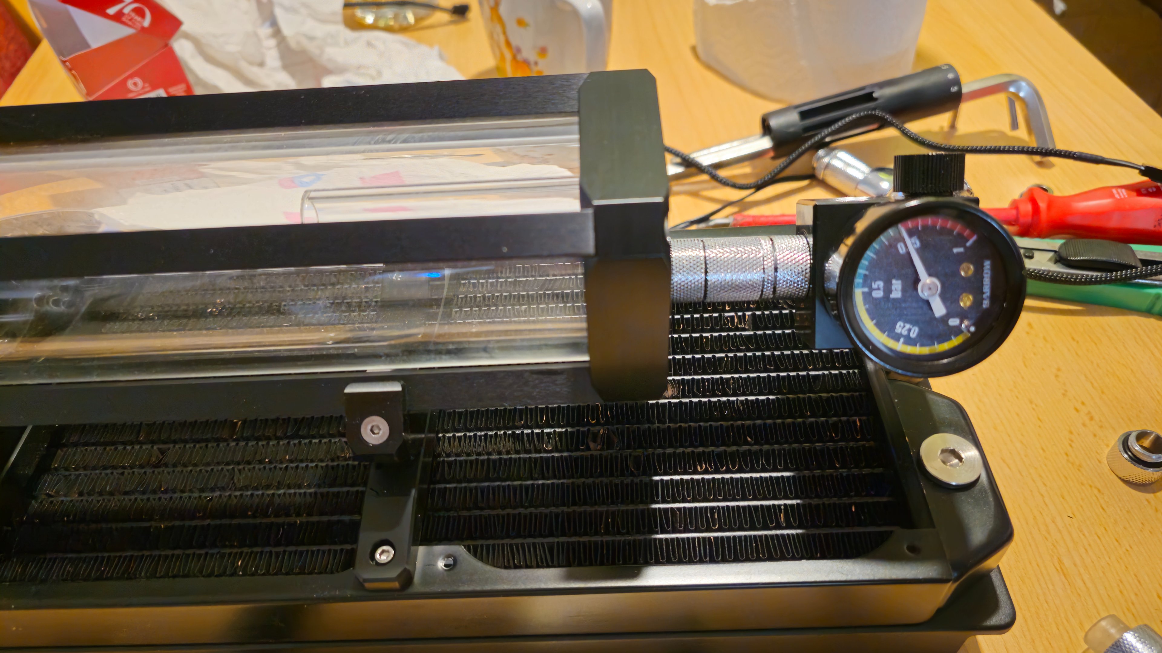 Hier kannst du wirklich nur systematisch einzelne Bereiche oder gar Bauteile einzeln testen. Zum Beispiel, wenn ich einen Kühlblock zum Reinigen zerlegt habe, wird dieser Block danach mit Druck getestet.