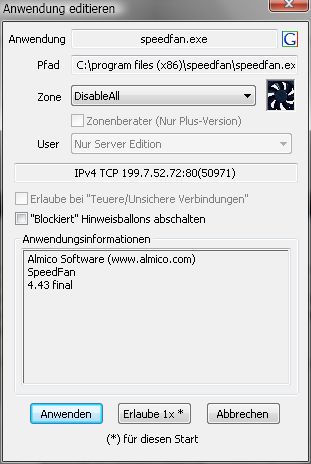 Nun habe ich festgestellt, dass das neue Speedfan deutlich länger braucht, bis es einsatzbereit ist. Und ich vermute mal, es liegt daran, dass SF 4.43 beim Start immer erst mal nach Hause telefonieren will, bzw. auf Updates überprüft. Dem habe ich aber Firewalltechnisch einen Riegel vorgeschoben.