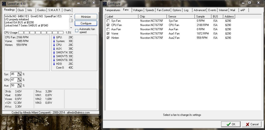 Soweit so gut. Beim ersten Start des System drehten alle Lüfter auf gefühlten 100 % und ich bekam das nicht in den Griff, auch über die BIOs war nichts zu machen. Also musste ein Programm her und so kam ich auf Speedfan. Habe mir viele Tutorials angesehen, auch das von Schnitzel (oder so ähnlich