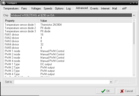 Allerdings springt diese Einstellung des öfteren einfach so von selbst auf "Thermistor 2N3904" zurück, dadurch wird dann die Temperatur mit 80°C anstatt 40°C angezeigt und Speedfan regelt dann natürlich die Lüfter sofort auf 100% hoch -> nervt extrem! Andauernd muss ich das wieder manuell auf "PII diode" umstellen. Dann funktioniert es stundenlang, bis es sich irgendwann einfach wieder von selbst umstellt. Das tut es in völlig unregelmässigen Abständen, aber bestimmt so 3 bis 4 mal am Tag.