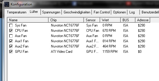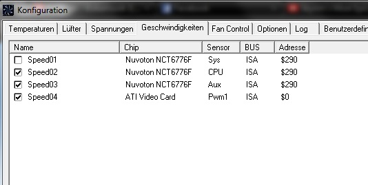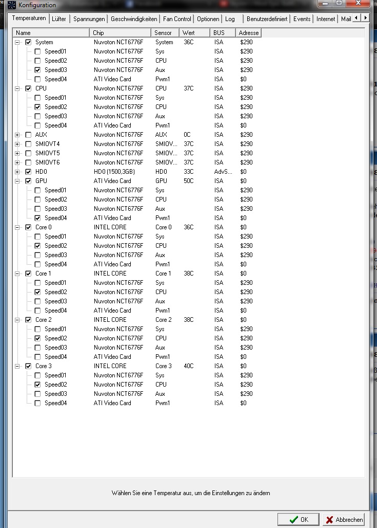 Ich hab folgendes PRoblem: Hab das Asrock z68 pro3 und einen Thermalright HR-02 Macho. Hab noch 2 Gehäuselüfter jeweils bei Cha_Fan 2&3 eingesteckt. Hab probiert das Tutorial möglichst weit zu folgen, aber naja, ging halt nicht gescheit. Den CPU Lüfter konnte ich garnicht steuern, nur einen Gehäuselüfter und die GPU war nach wie vor auch zu steuern. Unter Benutzerdefiniert sind bei mir unten andere Werte drin als im Tutorial. Welchen soll ich da nehmen? Bei den Spannungen hab ich garkeine Ahnung welche ich brauche und welche nicht. Ich weiß auch nicht wie ich was unter Temperaturen zuweisen muss. Übers UEFI kann ich die Lüfter perfekt kontrollieren, brauche Speedfan aber um semipassive Kühlung zu betreiben. Danke