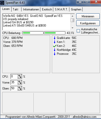 Im Bios ist alles "geregelt", beim Systemstar läuft kein Lüfter. Läd dann Windows SpeedFan wird alles laut und die Lüfter laufen auf 100%, also wenn SpeedFan sich einmischt, wirds laut. Ich möchte aber, dass alles dann noch still bleibt bis ich da selbst rum fuchteln möchte, denn 0% reicht i.d.R. im Idl bei mir aus.