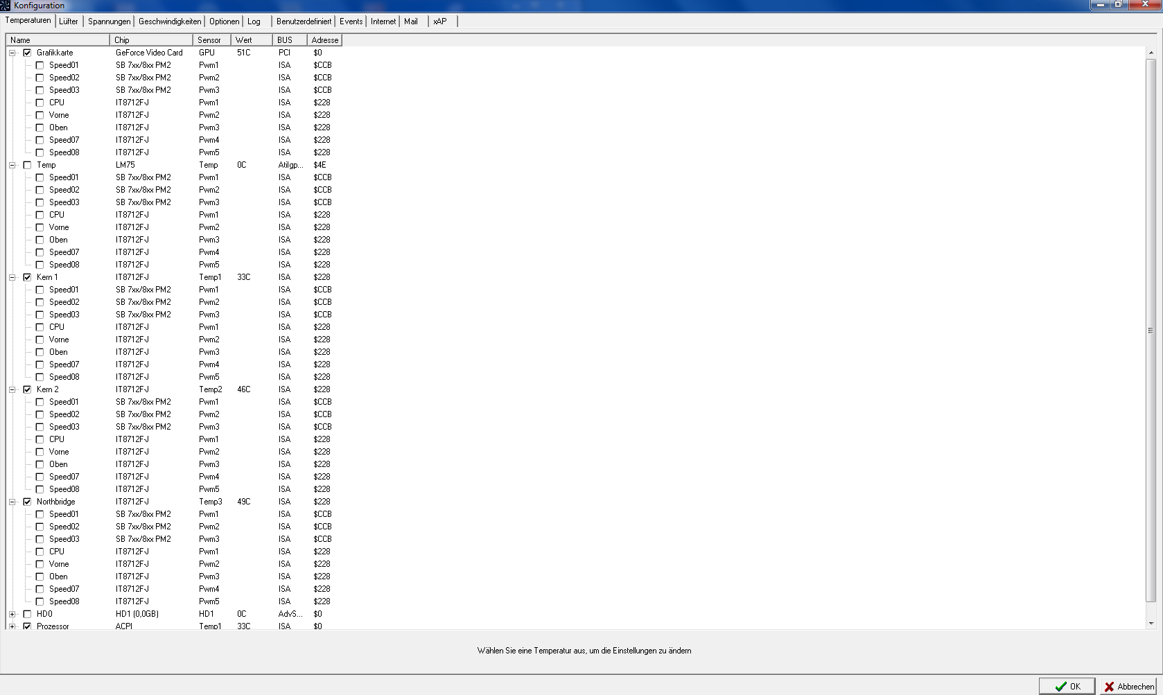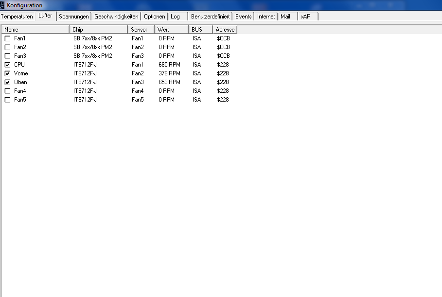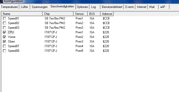 Dann müssen im ersten Reiter bei den Temperaturen die Haken bei allen unnötigen Sensoren raus, weil überall laufen alle Lüfter über jeden Sensor, also für CPU, den CPU anklicken und die minimale Temp einstellen, wo der Lüfter hochdrehen soll.